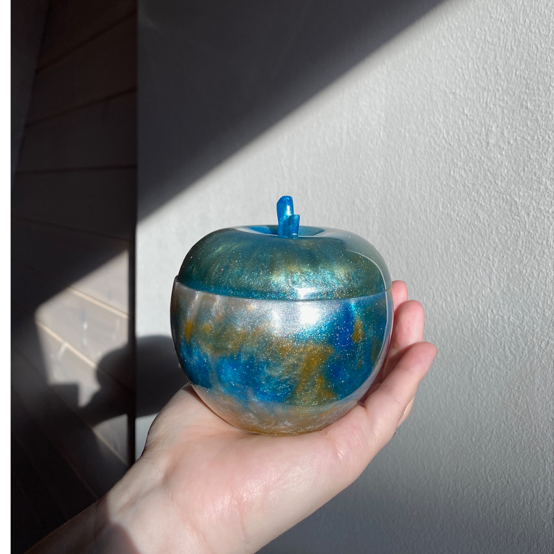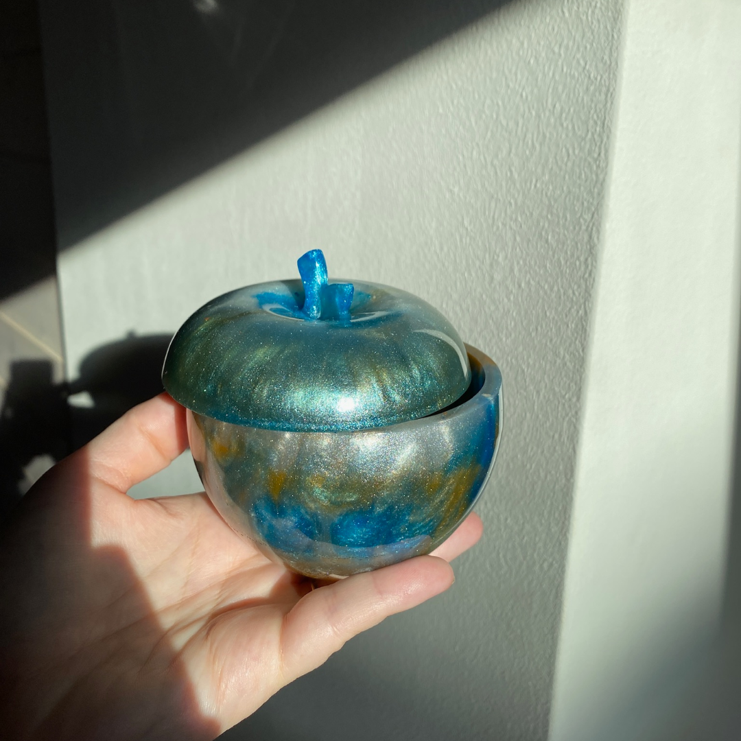 Epoksiidvaigust õuna kujuline ehtekarp kaanega. Läbimõõt 9 cm. Kerge. Pilt on illustratiivne.